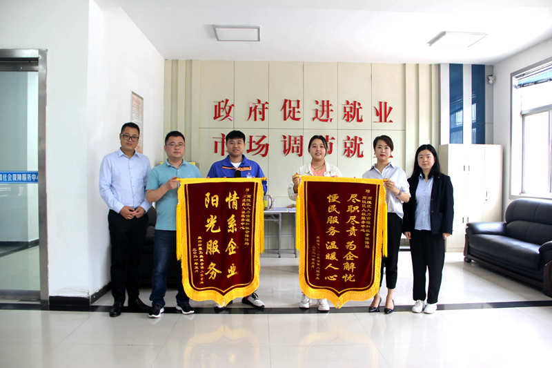 5月18日上午,絲路融豪服務管理中心經(jīng)理劉璐帶領(lǐng)入園企業(yè)代表將印有“陽光服務 情系企業(yè)”和“盡職盡責為企解憂 便民服務溫暖人心”的兩面錦旗送至高陵區(qū)人力資源和社會保障局、高陵區(qū)人社服務中心,對政府在園區(qū)服務過程中給予的傾心服務和大力支持表示感謝。
