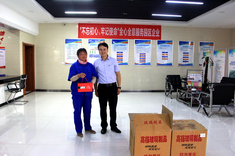 發(fā)放現(xiàn)場(chǎng),公司黨支部副書(shū)記惠洋洋帶領(lǐng)黨員把一個(gè)個(gè)紀(jì)念品送至員工手中。