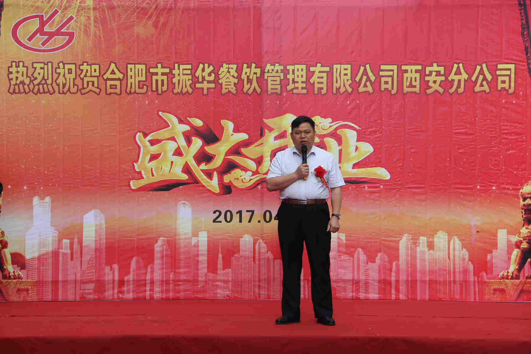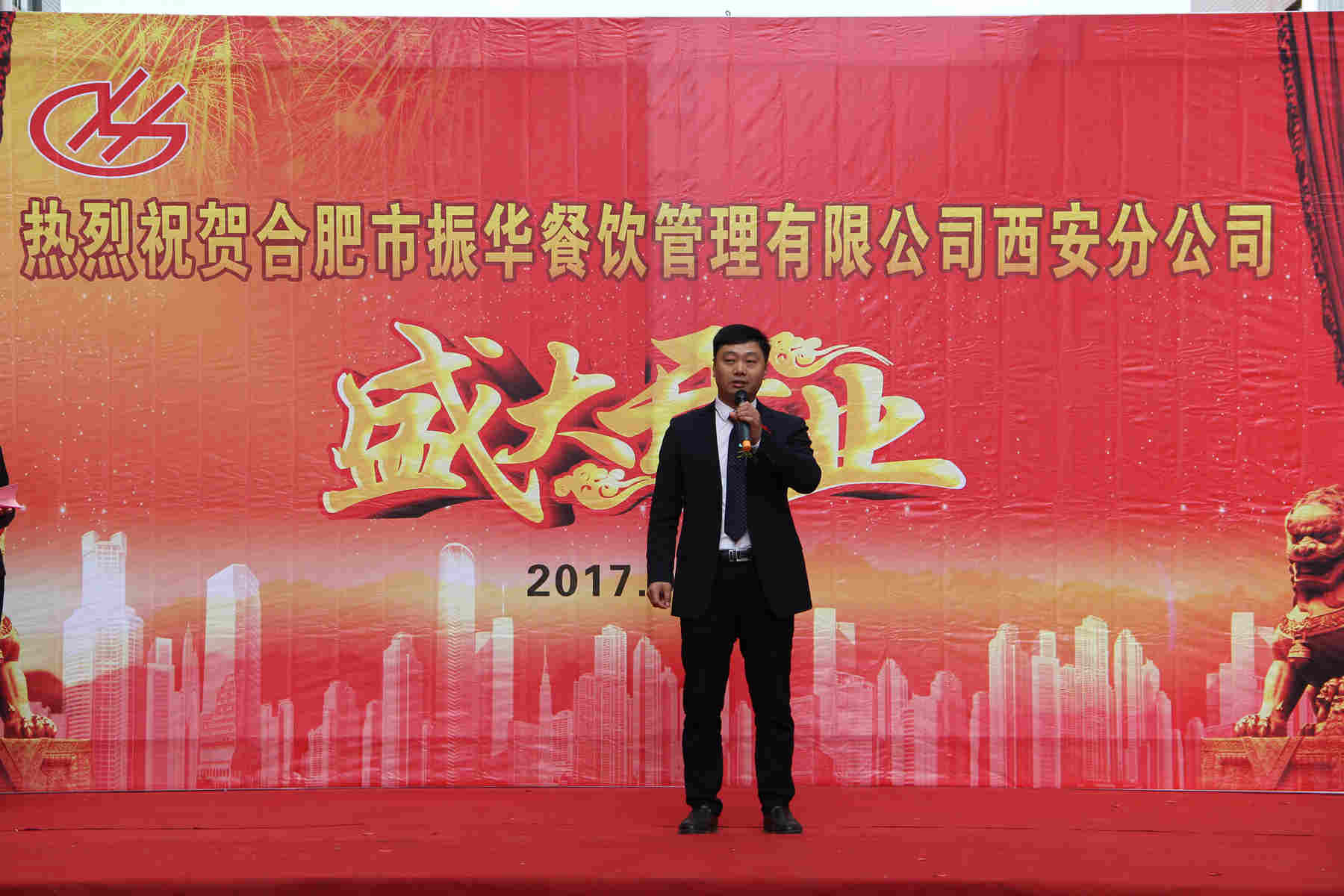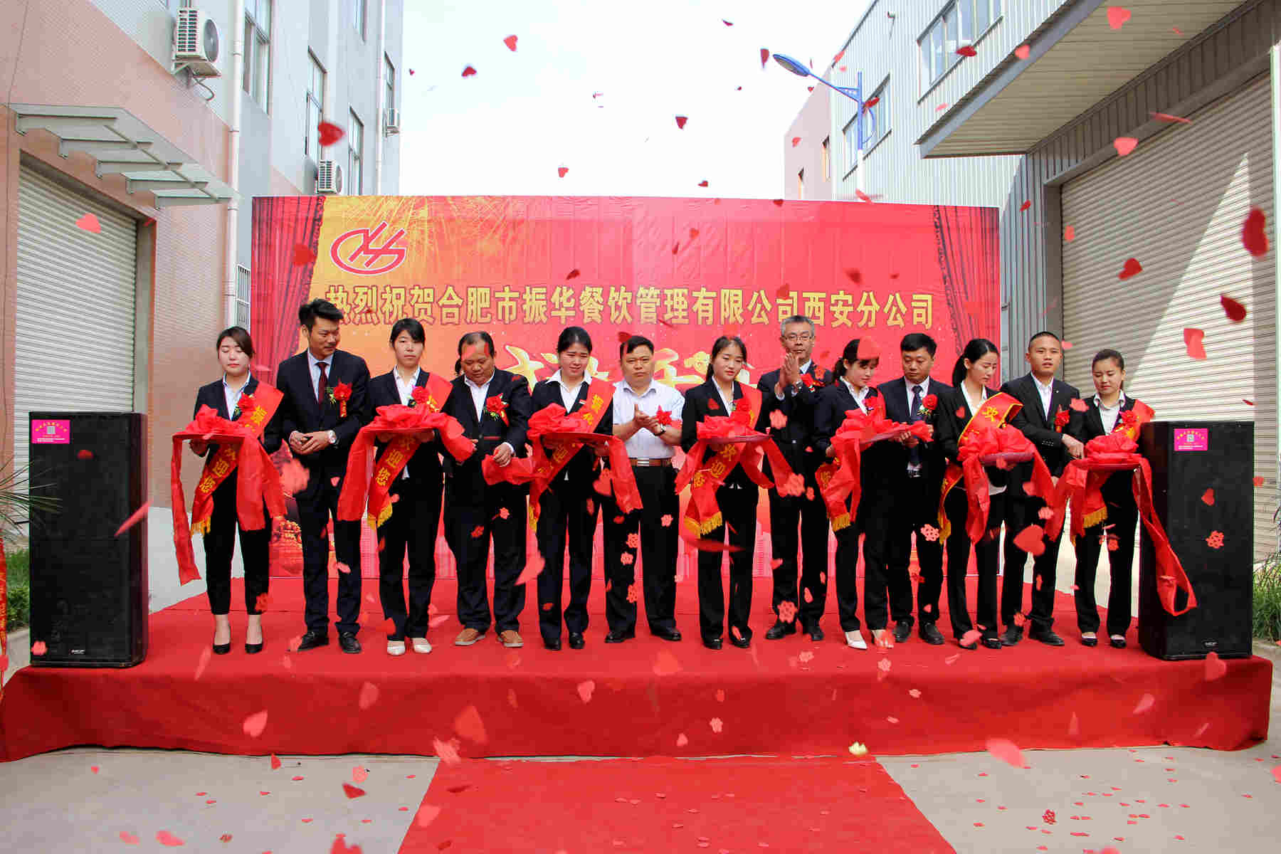 開業(yè)典禮上,首先由振華餐飲董事長張振華上臺致辭;其次由西安分公司經(jīng)理儲繼飛致辭并宣布開業(yè);隨后董事長、董事、各分公司經(jīng)理、西安分公司經(jīng)理及優(yōu)秀員工上臺剪彩;最后與會人員上臺合影留念。