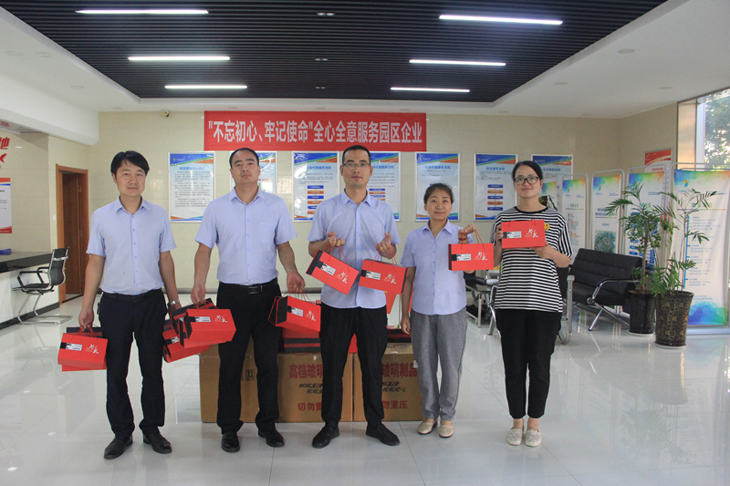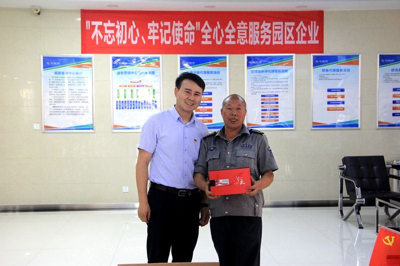 發(fā)放現(xiàn)場(chǎng),公司黨支部副書(shū)記惠洋洋帶領(lǐng)黨員把一個(gè)個(gè)紀(jì)念品送至員工手中。