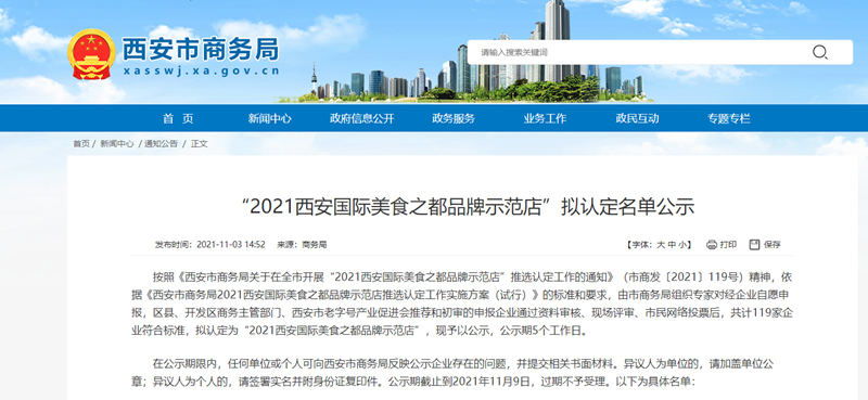 近日,按照依據(jù)《西安市商務局2021西安國際美食之都品牌示范店推選認定工作實施方案(試行)》的標準和要求,由市商務局組織專家對經(jīng)企業(yè)自愿申報,區(qū)縣、開發(fā)區(qū)商務主管部門、西安市老字號產(chǎn)業(yè)促進會推薦和初審的申報企業(yè)通過資料審核、現(xiàn)場評審、市民網(wǎng)絡投票后,共計119家企業(yè)符合標準,擬認定為“2021西安國際美食之都品牌示范店”。其中我園區(qū)食品企業(yè)西安陽云食品加工有限公司被擬認定為餐飲供應鏈優(yōu)選企業(yè)品牌示范店,西安全盛齋清真食品有限責任公司被擬認定為休閑茶飲、烘焙糕餅品牌示范店。