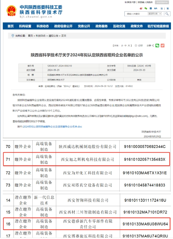 前不久,陜西省科技廳發(fā)布關(guān)于認(rèn)定2024年省瞪羚企業(yè)的公告,絲路融豪工業(yè)城園區(qū)企業(yè)西安旭之輝機(jī)電科技有限公司、西安德睿新汽車零部件有限責(zé)任公司分別被認(rèn)定為陜西省瞪羚企業(yè)及潛在瞪羚企業(yè)。
