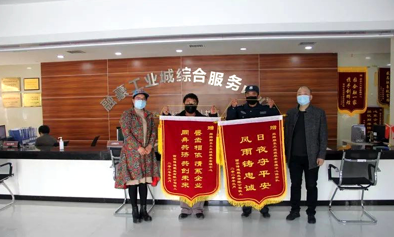 3月6日,絲路融豪工業(yè)城入駐企業(yè)西安博迪塑業(yè)有限公司負責人為服務管理中心和保安室送錦旗,感謝園區(qū)在春節(jié)疫情期間為企業(yè)提供的熱情服務。