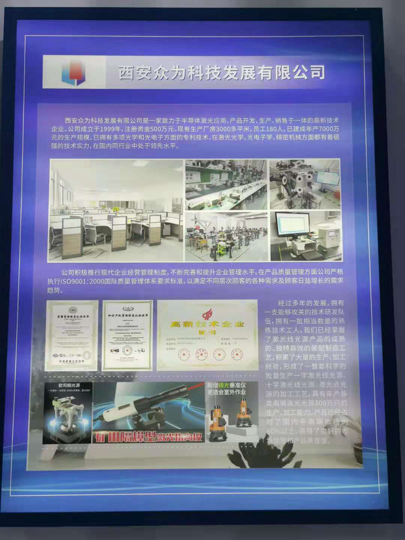 西安眾為科技發(fā)展有限公司是一家致力于半導(dǎo)體激光應(yīng)用、產(chǎn)品開發(fā)、生產(chǎn)、銷售于一體的高新技術(shù)企業(yè)。公司擁有多項(xiàng)光學(xué)和光電子方面的專利技術(shù)。在激光光學(xué)、光電子學(xué)、精密機(jī)械方面都有著很強(qiáng)的技術(shù)實(shí)力,在國(guó)內(nèi)同行業(yè)中處于領(lǐng)先水平。